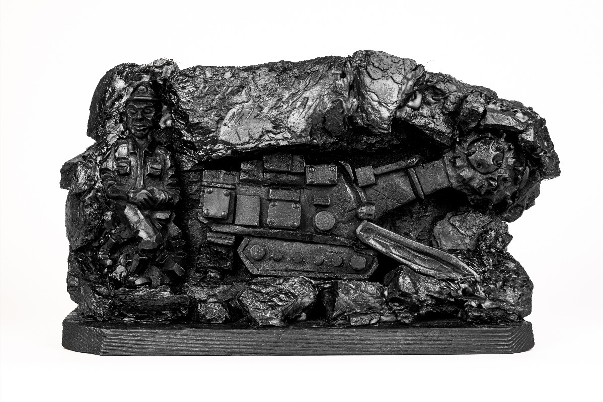 Górnik przy kombajnie, węgiel, grafit, drewno, wys. 28 cm, wyk. Robert Nowak, własność MOK-GHM w Jastrzębiu-Zdroju, fot. Maciej Kanik